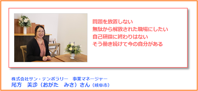 創業30年以上・岐阜市密着の人財サービス会社「サン・テンポラリー」。保育関係(官・民)や官公庁・民間企業など800社以上の信頼と実績。登録スタッフの75%が女性であることも特徴。岐阜県ワーク・ライフ・バランス推進エクセレント企業に認定。